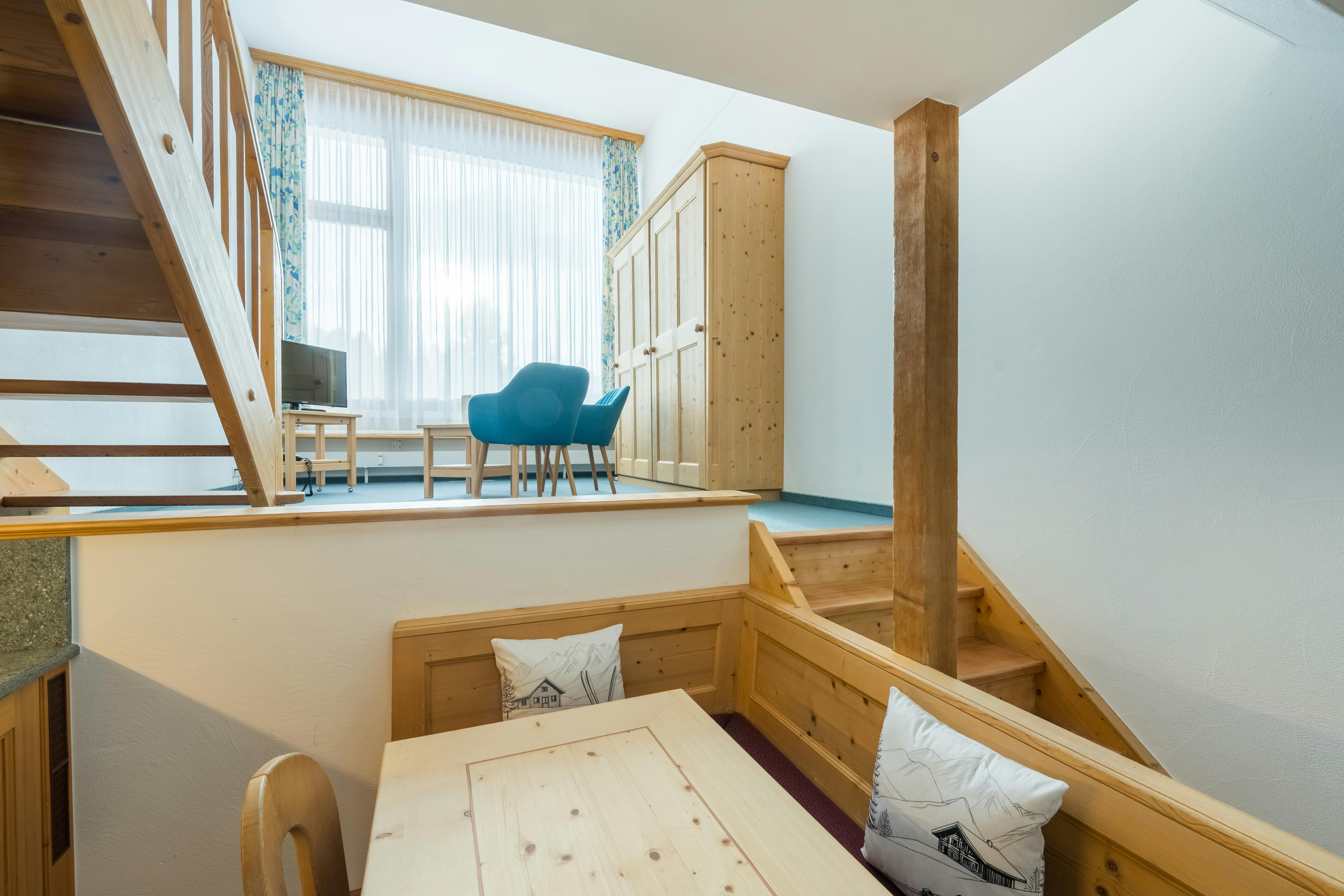 Le camere familiari sono molto confortevoli e hanno una grandezza di 60 mq disposte su tre differenti livelli con un letto matrimoniale e due letti aggiuntivi e godono di una splendida vista da una grande finestra panoramica. Tutte le camere sono dotate di w- lan gratuito, ed equipaggiate con cassaforte, minifrigo, phon, specchio, bagno privato con doccia, prodotti di cortesia, televisore, accappatoio e ciabatte da camera. Vi preghiamo di contattarci con anticipo per aggiungere un'altra persona . Cucina non utilizzabile. Dimensioni dei letti: letto matrimoniale con 2 materassi 90 * 200 cm. 2 letti a scomparsa 90 * 200 cm al piano intermedio.