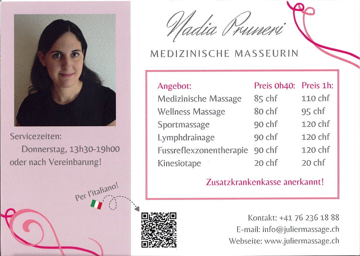 We work exclusively with www.juliermassage.ch Mrs Nadia Pruneri, certified medical masseuse FA.